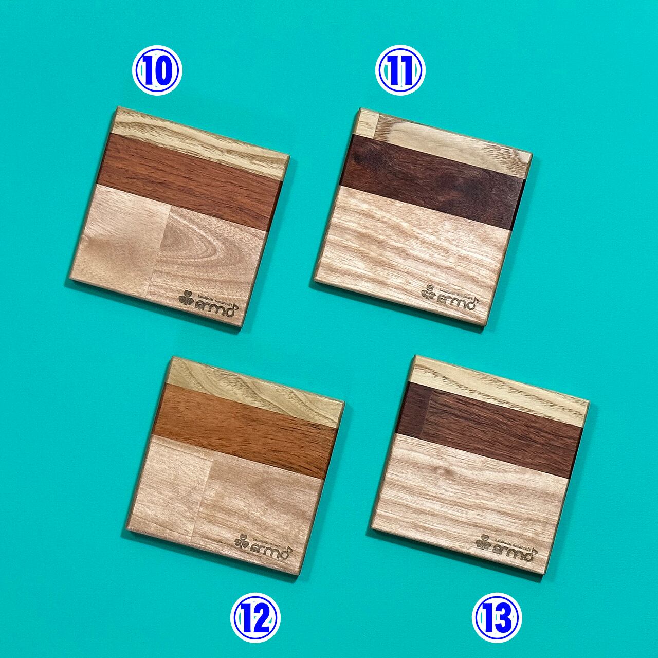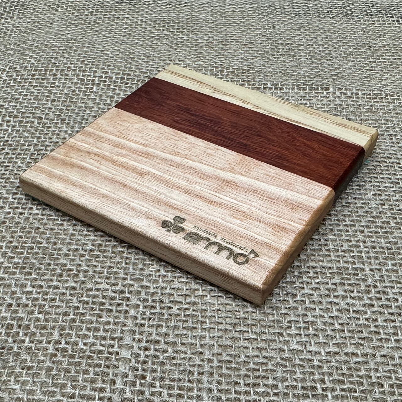 廃棄予定だった規格外品の無垢フローリング材を使った寄木タイプのコースターです。